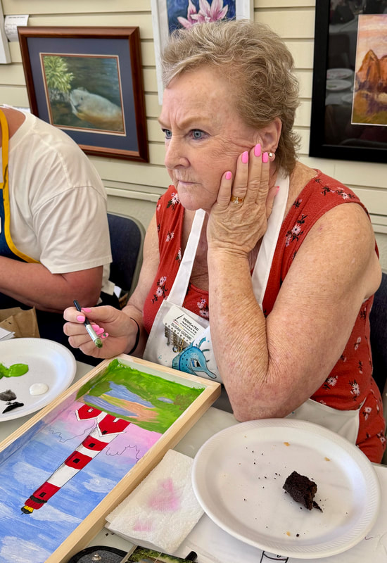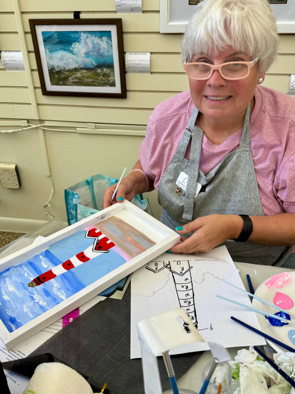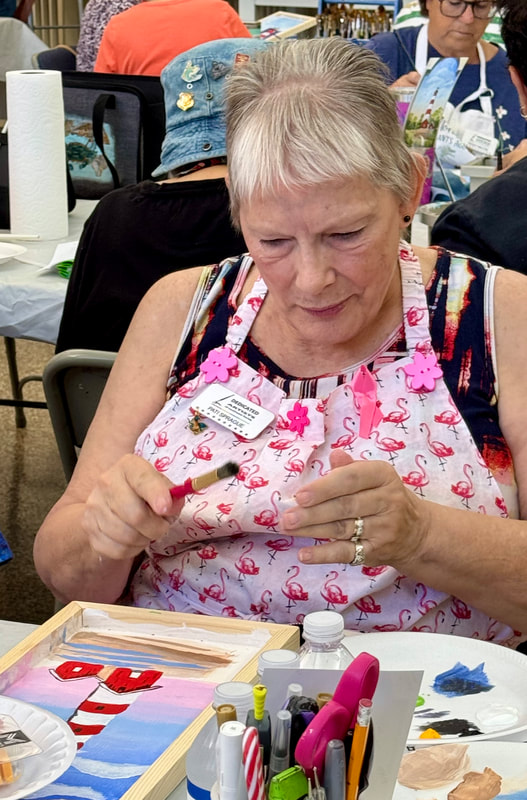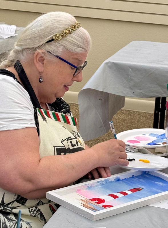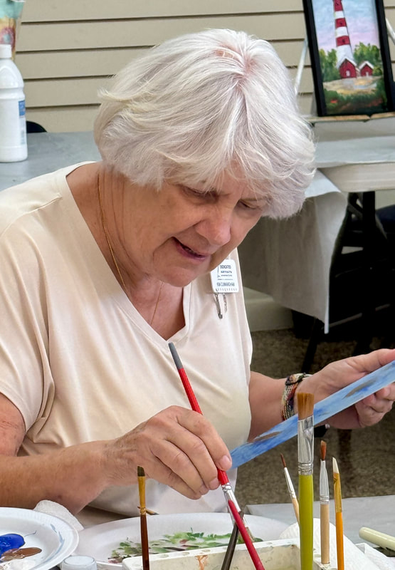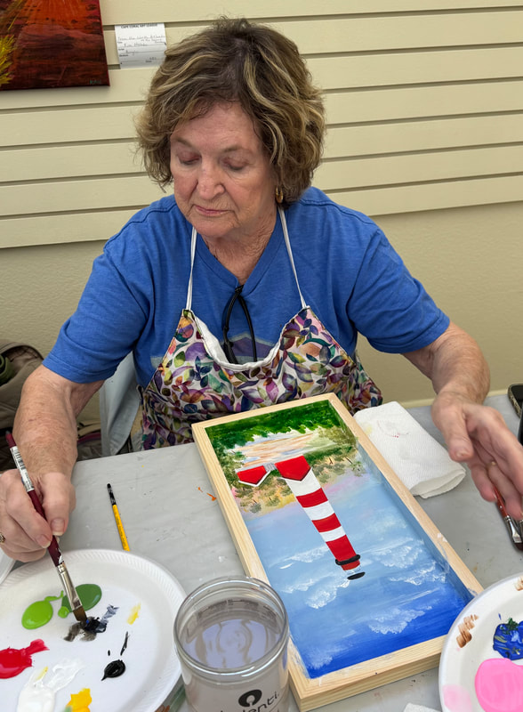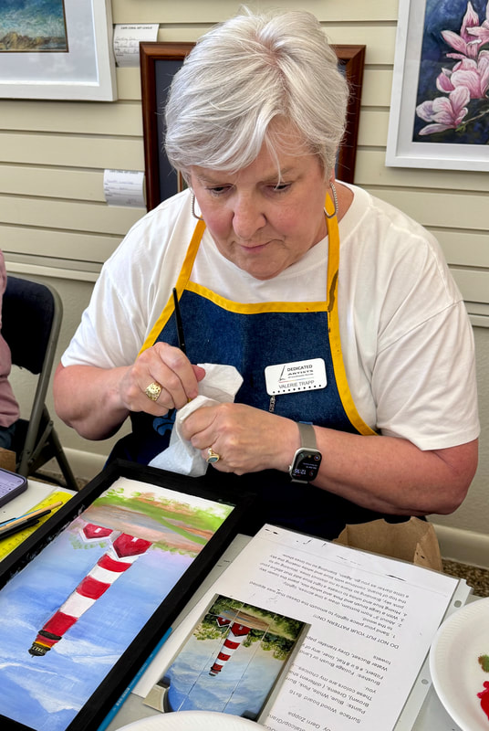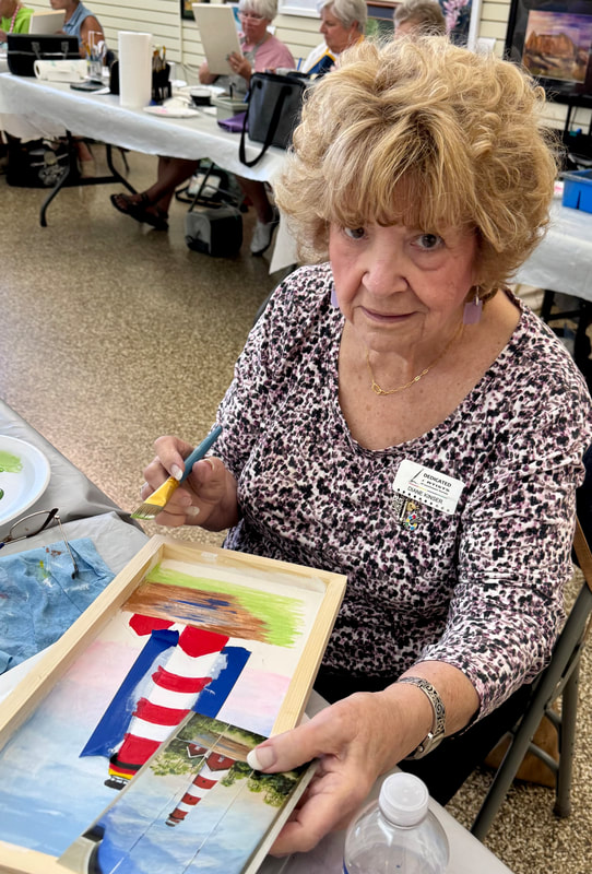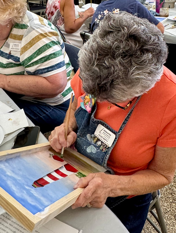 The Assateague Light program was relaxing and most successful as Gerri led us to paint without the usual pattern where it is necessary to stay inside of the lines. Active in art education for over three decades, Gerri is a fine artist who actively volunteers at various Galleries around the Fort Myers area. Members were most appreciative of Gerri’s skill as a teacher as she led us through this design by Ros Stallcup. Enjoy the photos of our show-and-tells and of members as they enjoyed another great DASF program…