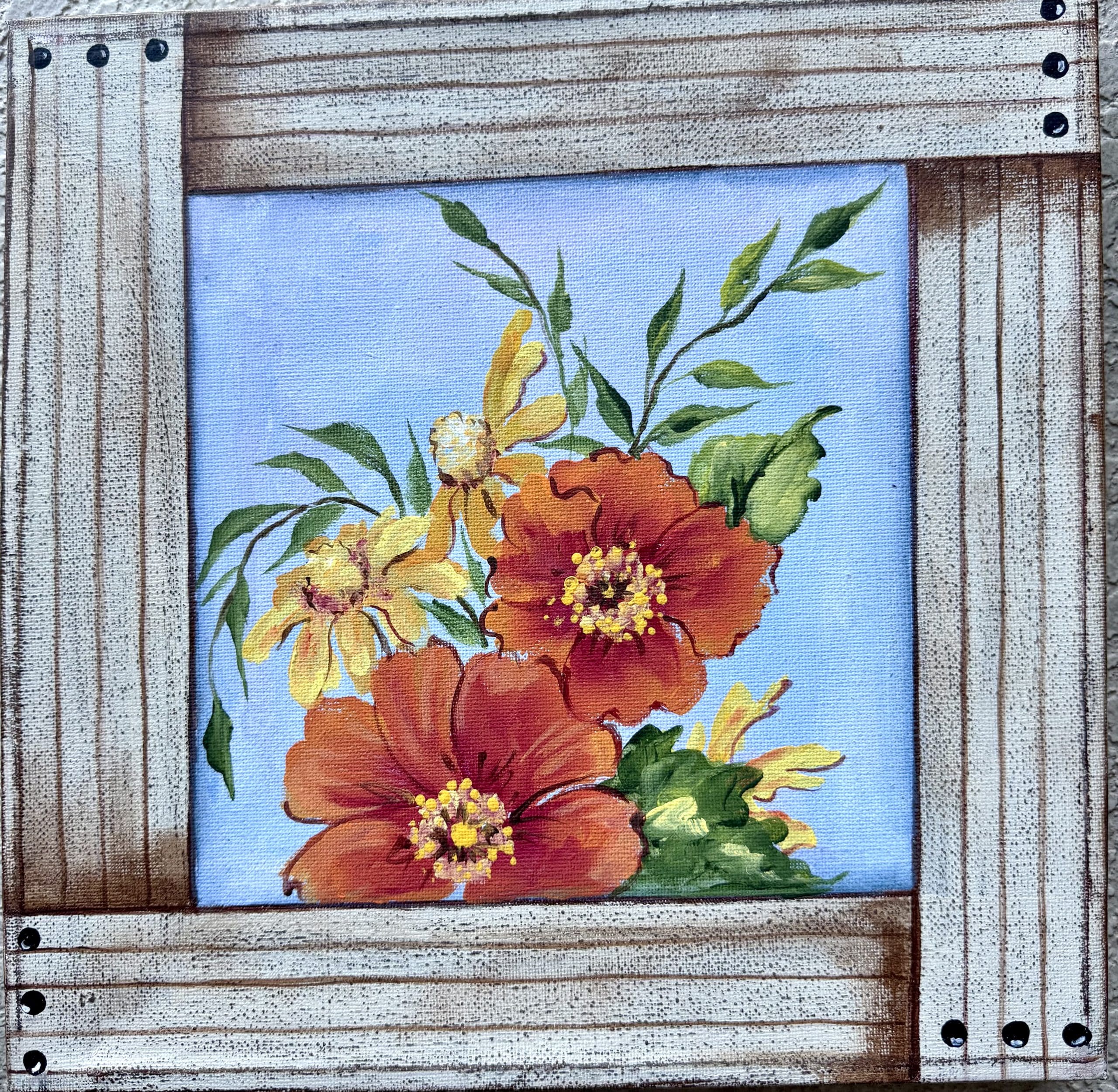 These analagous colors that lay next to each other on a color wheel mimic a Florida sunset against a blue sky. The 12-inch canvas used in this program has a trompe-l’oeil frame that completely fools the eye by painting the frame using candle waxing techniques.