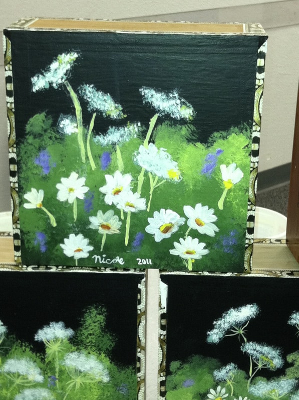 All supplies are provided and the students go home with a set of finished notecards or maybe a beautiful treasure box to hold their collectables. The photos here at the Lee Country library in downtown Fort Myers show wood cigar boxes turned treasure box that have been decorated with a Roz Stallcup design taught by Suzanne Mikulka. Artists come in all ages. In this class the boxes were created by painters as young as first grade and as old as …well, let’s just say retired! Most had never painted before…