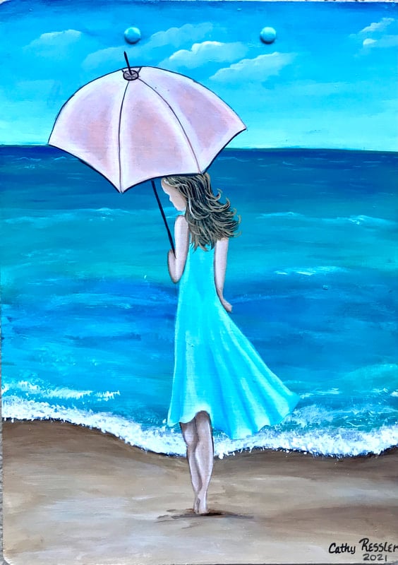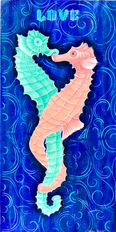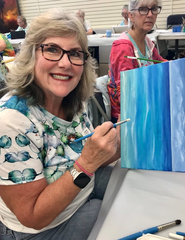 Fast forward to my late 30s with recurring allergist appointments and art entered my life. A nearby arts-and-crafts shop pulled me in. Sitting on that shop floor in a back corner after each appointment was my weekly happy place! Surrounding myself with painting books became my routine. After meeting an amazing artist Sandy Ryan while in the shop, a brush was never far from my hand. Sandy got her start in oils but was an acrylic artist by the time I took weekly classes with her. Time on task led to some art fluency and traveling to paint with Big Brush teachers around the country helped improve techniques. I also joined as many painting groups as I could travel to for the next 20 years and started stepping up to teach.