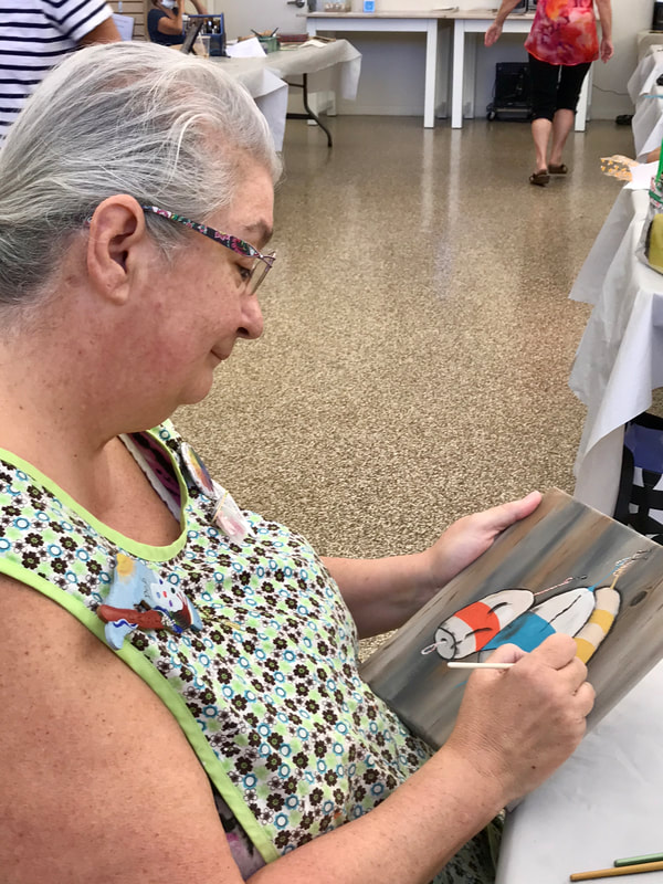 Search you home, the resale shops, the flea market… This month you need to think creatively. Jackie wanted to see what beautiful ideas her students would come up with. Bring a canvas to paint on – and you might reproduce this for your 2020 Christmas cards. OR a Holiday Tray to gift OR a small table top, OR a planter