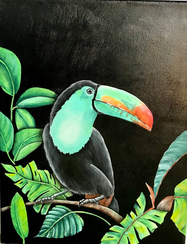 Toucan beaks are a bit like fingerprints showing lots of variations. While toucan beaks are large they are quite light due to air spaces. Toucan habitat is in the tropical rain-forests of South America. The toucan is a fun bird to paint!