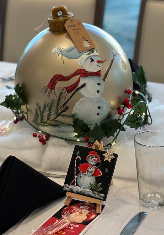 New this year is a ‘Live Auction‘ of 15-original centerpieces. The oversized ball ornaments, each hand-painted with an original winter snowman, nestled in Buffalo snow and surrounded by a lighted red and green holiday garland will give your home holiday decorations a beautiful lift.