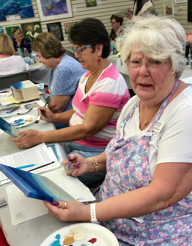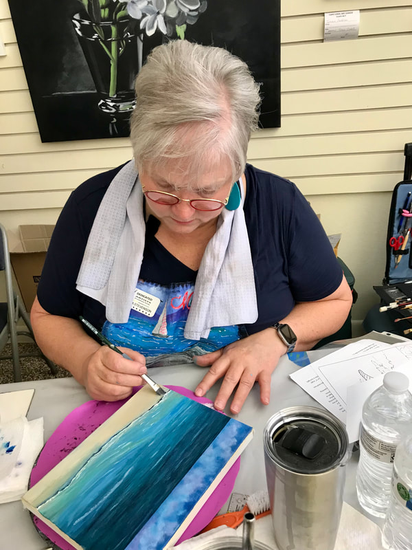 Jackie teaches how to create movement in your water and sky with lots of color contrast as a single horse conch creates the focal point,
