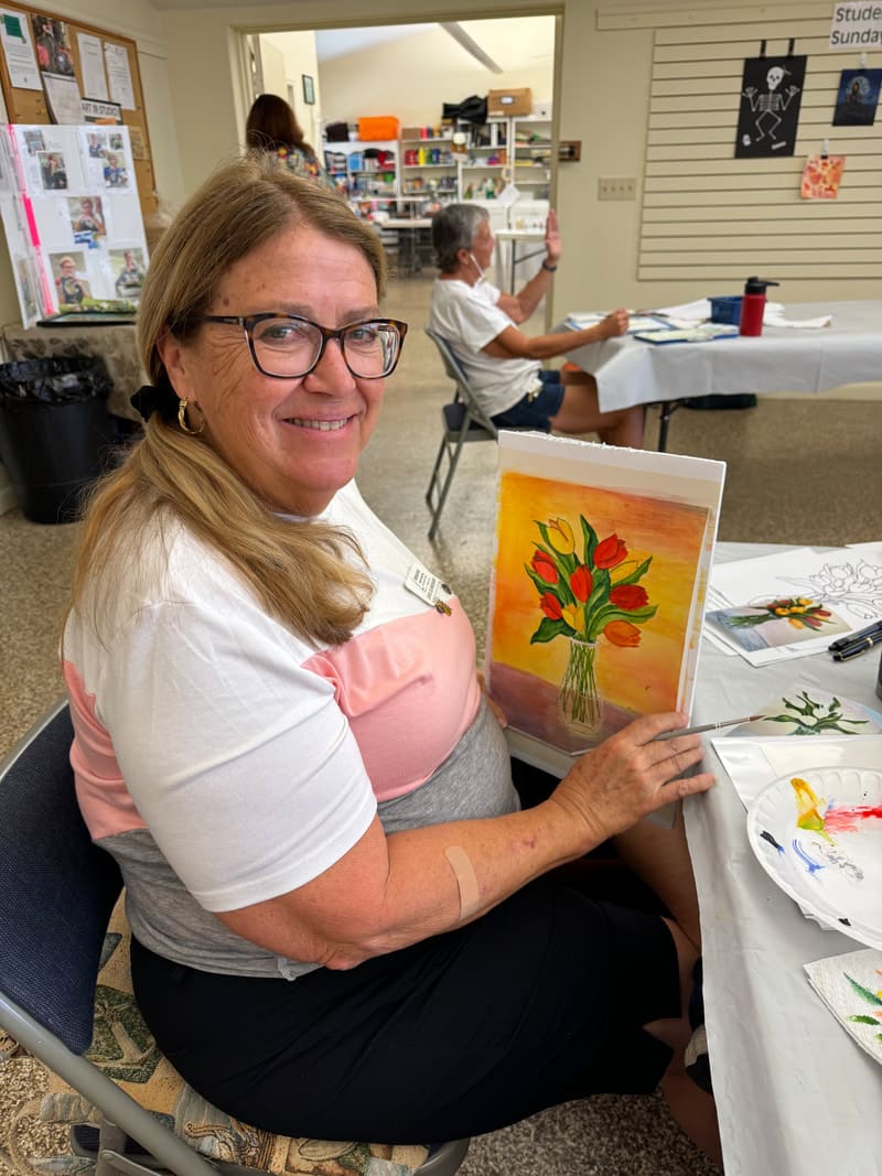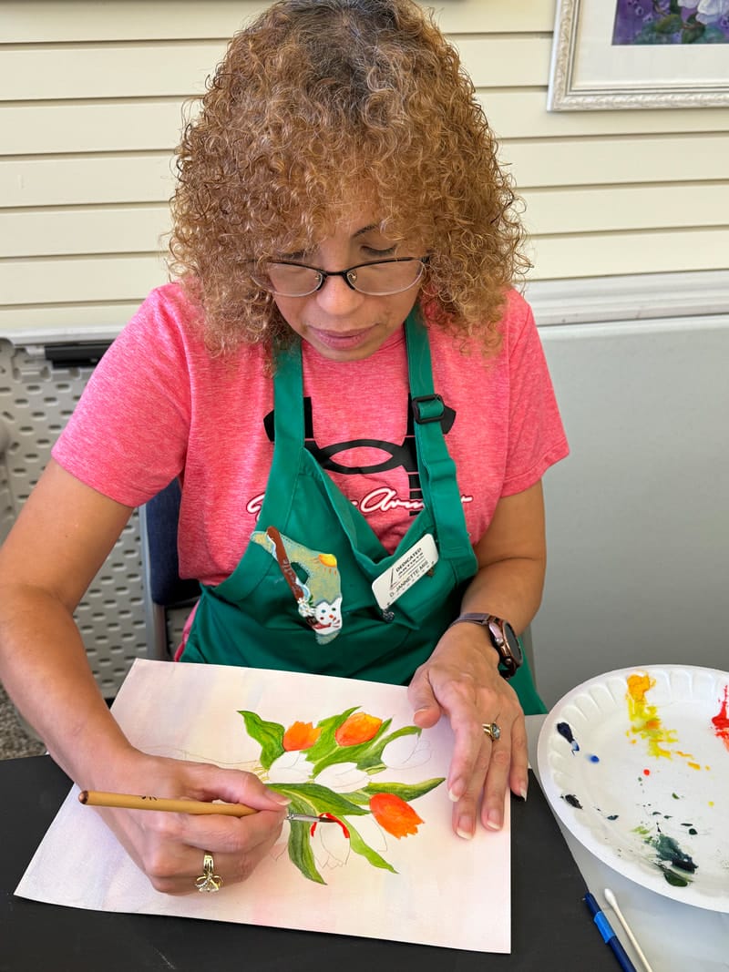 A beautiful bouquet of flowers from Dick’s garden inspired this painting. Color variations utilizing washes and intense pigment create dimension in this original painting. Jackie will lead us to create our own bouquet of spring beauties!