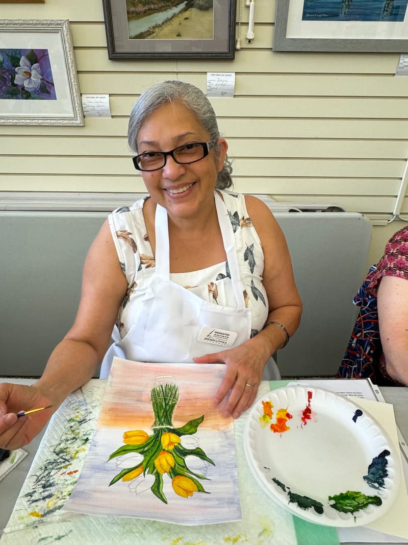 Jackie Marth is one of our favorite teachers with her beautiful art and original designs. At this program we learned that watercolor CAN be fun without water and paint running everywhere! With a room full of 40 painters that is quite an accomplishment. Thank you, Jackie – You did good…